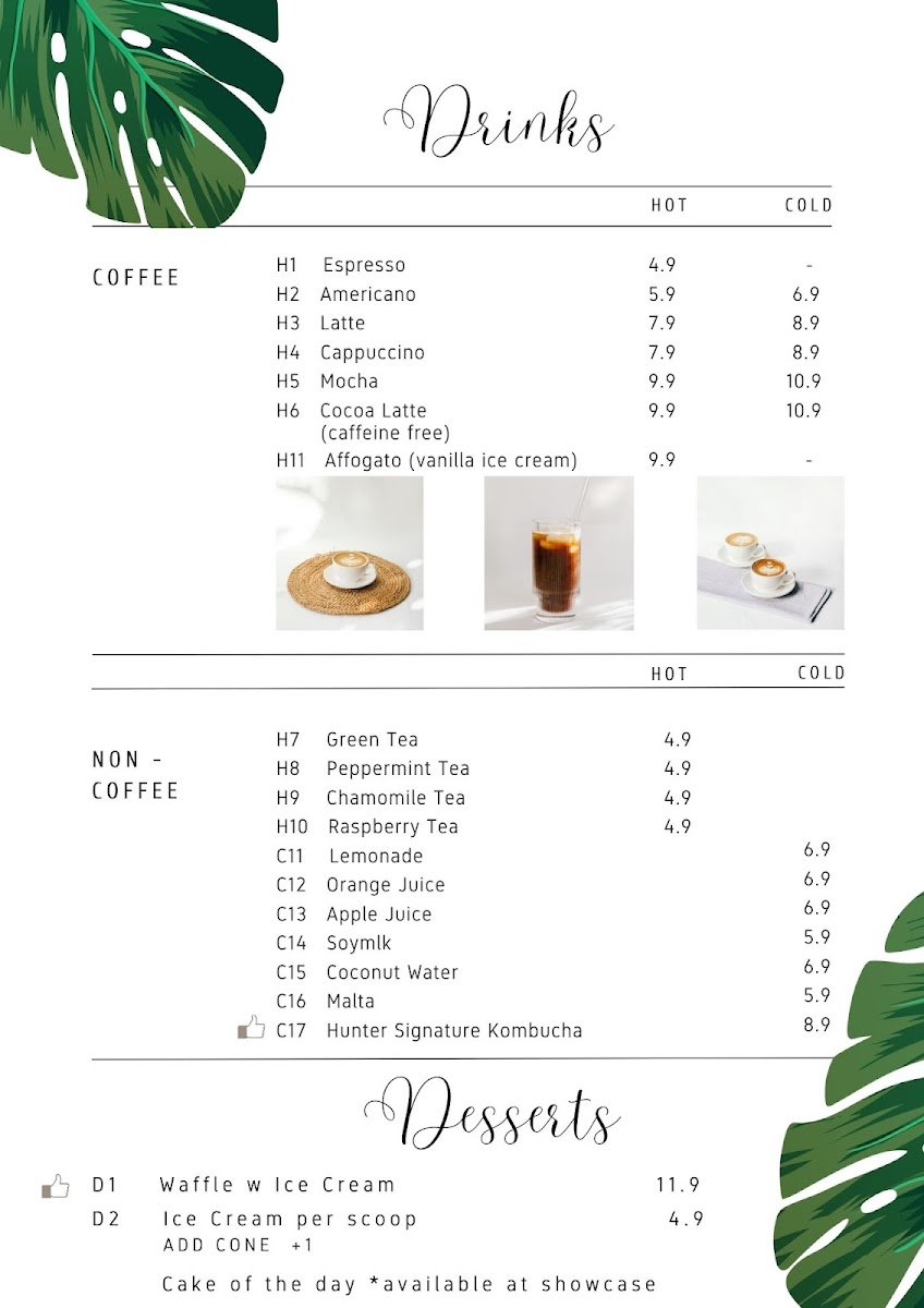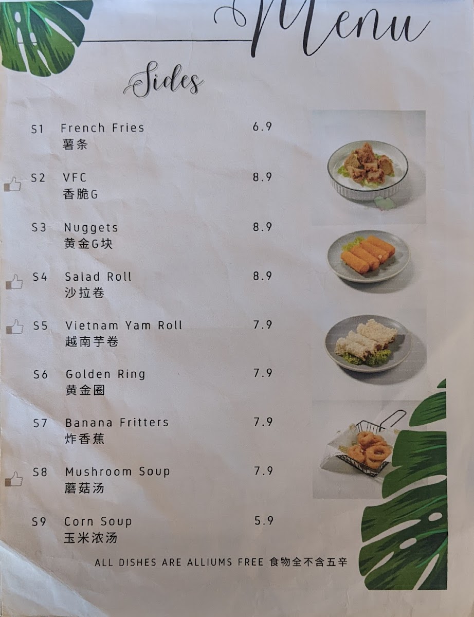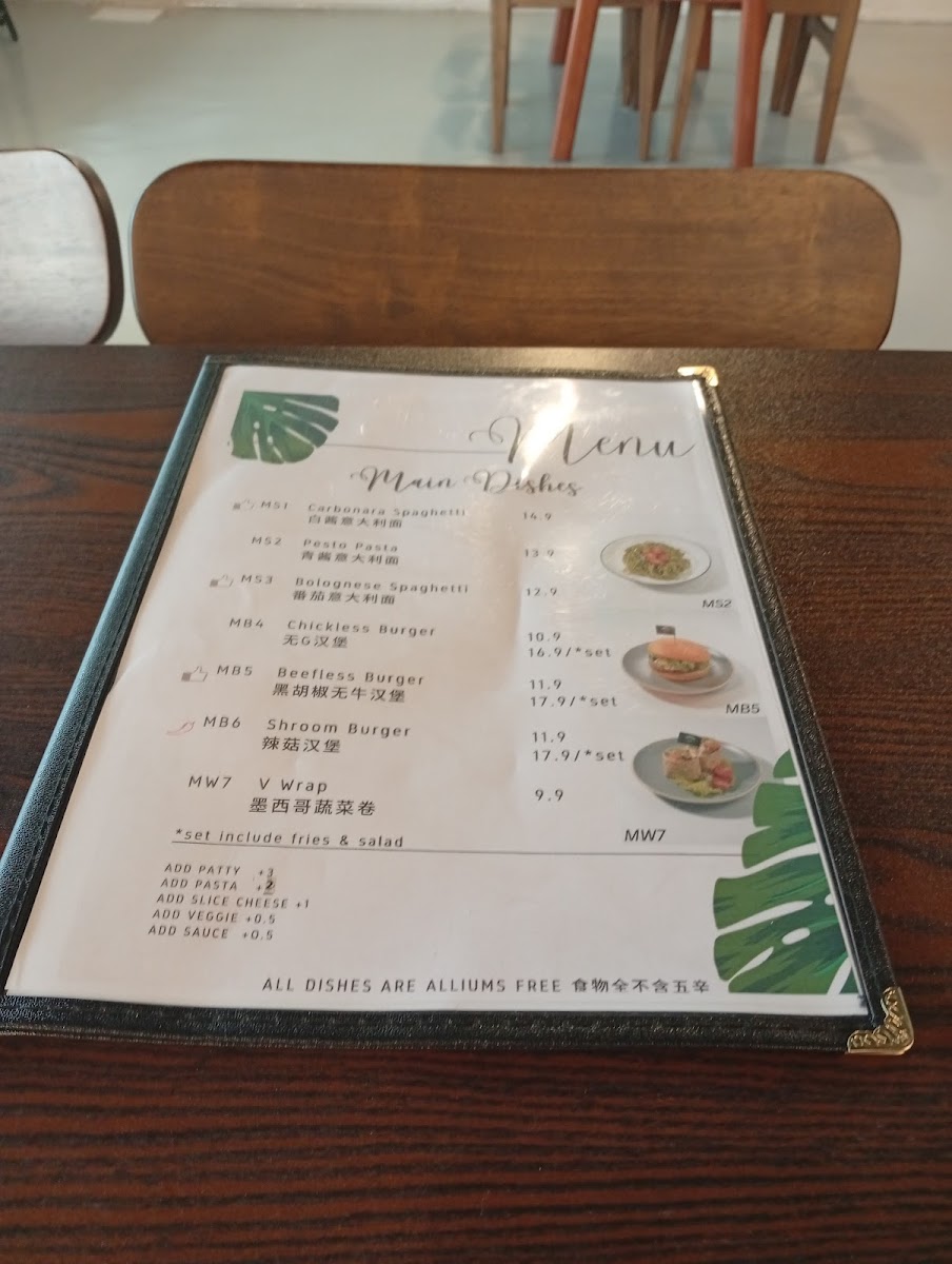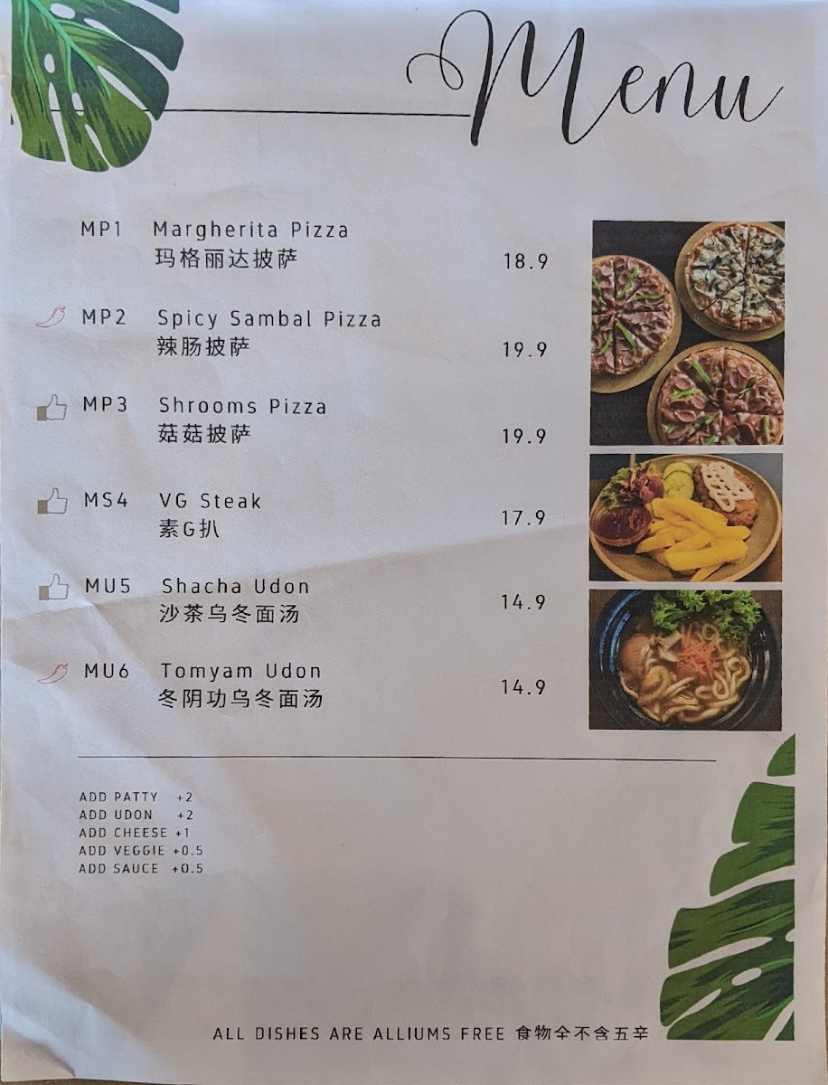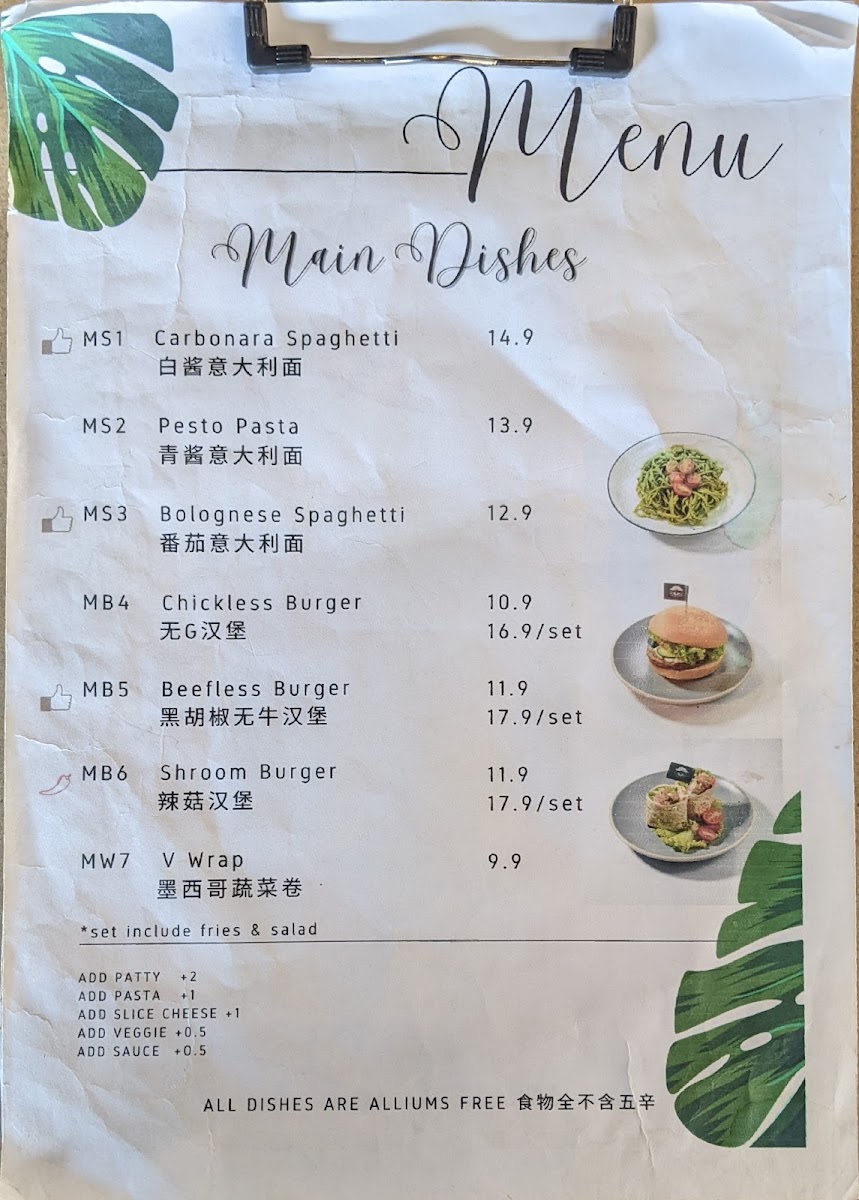The menu features a range of vegetarian options with a focus on Western-style dishes and some Asian-inspired items. It includes a variety of main courses such as pasta, burgers, and udon, as well as side dishes like baked mashed potatoes. Drinks include handmade kombucha and hot beverages like hot chocolate.